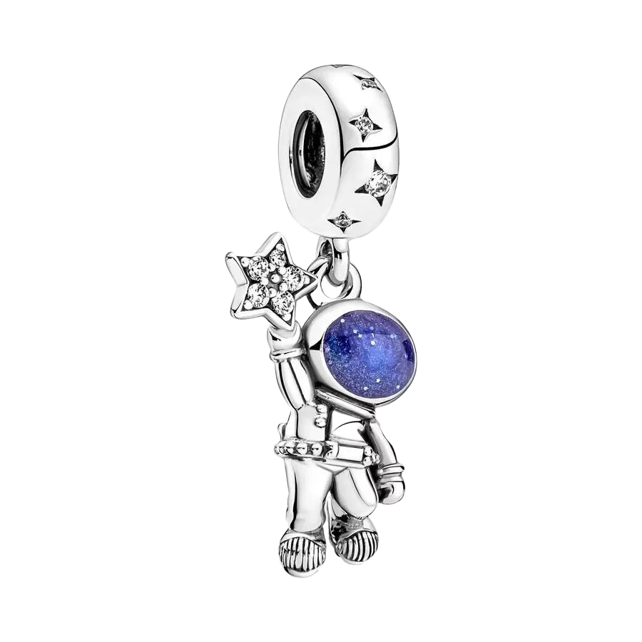 Explora las maravillas de la galaxia con el Charm Colgante Astronauta en la Galaxia. Este charm en plata de primera ley presenta un traje de astronauta espacial adornado con microesferas y una circonita cúbica transparente que da forma al tanque de oxígeno. El esmalte azul ilumina la visera del casco. El brazo del astronauta presenta un corazón recortado decorado con una gema brillante y el astronauta sostiene una estrella brillante adornada con circonitas cúbicas transparentes. Este charm estelar sirve como recordatorio para que alcances el cielo.