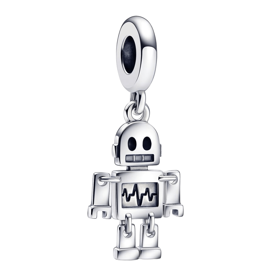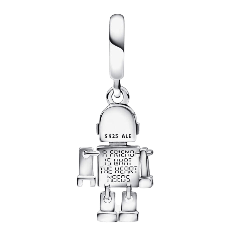Da la bienvenida a un nuevo amigo con el Charm Colgante Bot el Robot. Este pequeño compañero, en plata de primera ley, se presenta embellecido con esmalte de color negro y blanco, así como con brazos y piernas móviles, dientes cuadrados y ojos redondos que le aportan personalidad. La inscripción de su torso dice: "A friend is what the heart needs" (Un amigo es lo que nuestro corazón necesita). Lleva este charm como recordatorio de como las personass que adoras te hacen soreír e iluminan tu día.