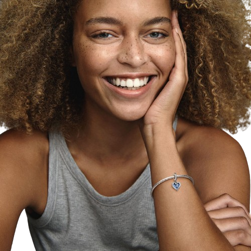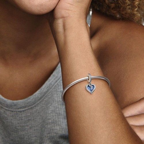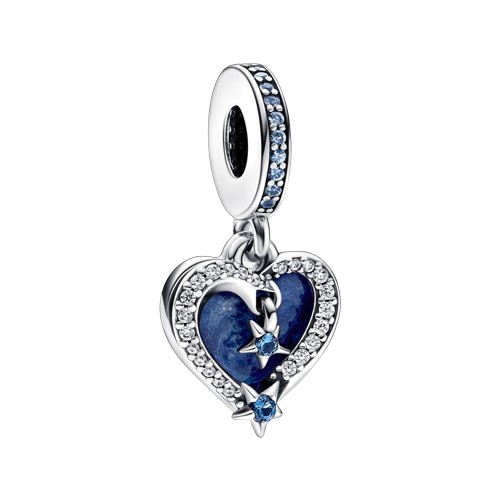 Dos estrellas fugaces se unen para crear un contorno en forma de corazón en este divertido y romántico charm colgante doble elaborado en plata de primera ley. Cada estrella está engastada con un cristal sintético azul y las estelas de las estrellas están adornadas con circonitas cúbicas transparentes en pavé. Detrás de las estrellas, un efecto de galaxia en espiral aparece en la parte posterior del colgante, creado con esmalte brillante en diferentes tonos de azul. El reverso de la parte esmaltada está grabado con el mensaje "I fall in love with you every day." (Me enamoro de ti todos los días). Captura la magia del cielo nocturno y regálaselo a la persona que amas.
