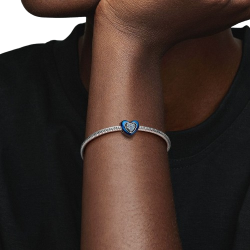 Siente el amor en frescos tonos de azul con el Charm Corazón Giratorio Azul. Esta joya con forma de corazón en plata de primera ley se ha embellecido con esmalte azul transparente aplicado a mano, algo perfecto para darle un toque de color a tu joya. Uno de los lados de este charm tiene un disco giratorio cubierto de brillantes gemas de color azul por un lado y por el otro un mensaje grabado que dice "My favourite PERSON" (Mi persona favorita). Nota: el disco no gira cuando se lleva puesto el charm, así que te recomendamos decidir qué lado quieres mostrar antes de lucirlo. Regálaselo a tu mejor amigo, así se los dejarás claro por si había alguna duda sobre tus sentimientos.