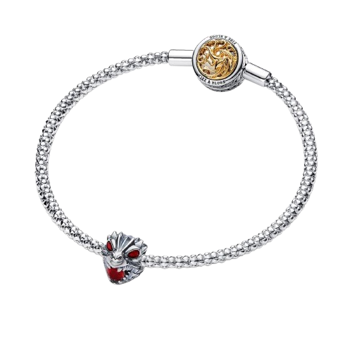 Escucha el rugido con nuestro Charm Dragón de Juego de Tronos. Fabricado en plata de primera ley, el charm del dragón se presenta con un patrón de escamas en la cabeza de la criatura y gemas rojas con forma de pera engastadas en los ojos. El dragón se presenta rugiendo con la boca abierta, unos dientes que causan asombro y un gran cristal sintético de color rojo en su interior, que representa el fuego que respiran para servir y proteger a sus seres queridos. Inspirado en las poderosas y míticas criaturas de Juego de Tronos, este charm del dragón de Pandora te permite mantener cerca su asombroso poder.