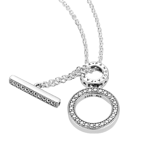 Atrévete con el Collar en T doble aro. Geométrico y moderno, este collar ajustable con barra en T se presenta acabado a mano en plata de primera ley y circonitas cúbicas transparentes con engastes en grano en la parte delantera del aro. La barra, que está embellecida con detalles de corazones. El logo de Pandora se presenta en la parte delantera y trasera del aro pequeño, junto con corazones recortados en el lateral. Llévalo solo o combínalo con otros collares de Pandora. Este collar es realmente cautivador.