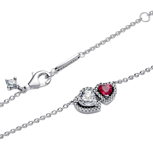 Lo que quiere el corazón. El Collar Halo Corazones presenta dos corazones conectados que simbolizan el amor profundo. Creado en plata de primera ley, este diseño se presenta con un cristal artificial de color rojo con talla con forma corazón y una circonita cúbica transparente con talla clon forma de corazón rodeada de brillantes gemas engastadas en pavé. Con una cadena de cable ajustable (45 cm, 41,5 cm y 38 cm), es perfecto para combinar o llevarlo solo para darle un toque romántico a tu look.
