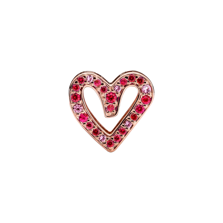 Deja que tu amor brille con el Charm Corazón Rojo y Rosa A Mano Alzada Rubí Brillante. Acabado a mano con un recubrimiento electrolítico en oro rosa de segunda ley de 14K, este charm presenta el contorno de un corazón dibujado a mano alzada abierto y embellecido con rubíes sintéticos talla brillante. Los laterales se han decorado con corazones y símbolos de la X como una divertida interpretación de la abreviación inglesa para besos y abrazos "XOXO". Moderno, elegante y dulce, este brillante charm te ofrece el modo ideal de llevar un recuerdo de las personas y las pasiones que llevas cerca del corazón.