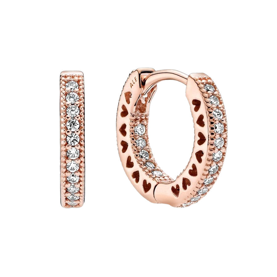 Enamórate de estos Pendientes de Aro Corazón en Pavé. Inspirados en el diseño de la colección Pandora Signature, estos aros se presentan acabados a mano con un recubrimiento de oro rosa de 14 K). Tanto el interior como el exterior de estos aros se han embellecido con circonitas cúbicas transparentes para hacerlos brillar. Como detalle añadido, los laterales de cada pendiente se han decorado con corazones recortados. Combina estos aros con tu pulsera de Pandora Signature en el mismo tono para crear un look clásico.