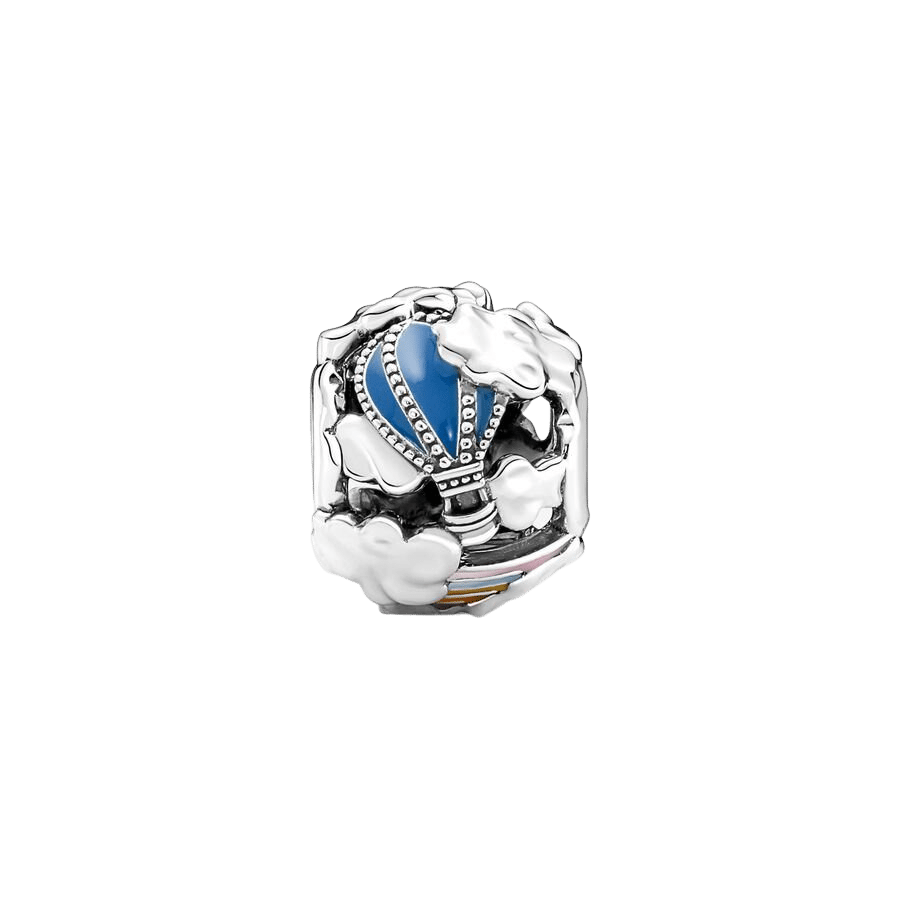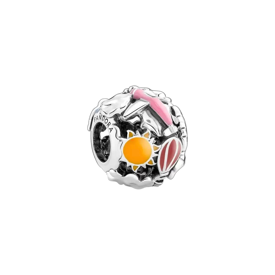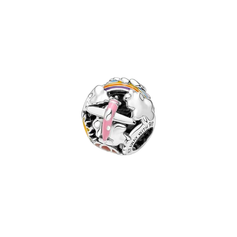 Vuela en las alas de la aventura con este colorido charm Viaje y cielo arcoiris. El charm en filigrana en plata de primera ley presenta motivos de viaje que incluyen globos aerostáticos y un avión volando entre las nubes, el sol y el arcoíris, creados con brillante esmalte aplicado a mano. El charm presenta en un lateral las palabras «FLY AWAY WITH ME» (Vuela conmigo). Llévalo para recordarte a ti mismo tus aventuras de viaje y sueña con los que están por venir.